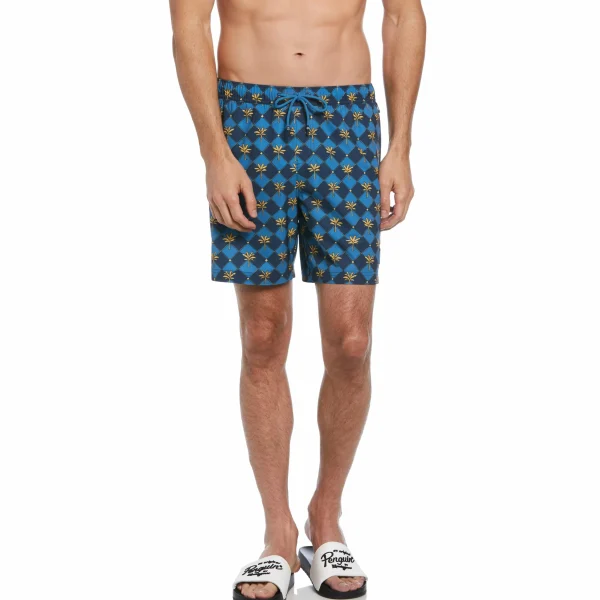 These men’s swim trunks from Original Penguin are made with recycled material, so you can enjoy eco-friendly swimwear. The quick-dry finish and back pocket provide added functionality while an allover print adds summery vibes whether you’re at a beach resort or pool. These men’s swim shorts are finished with a slim fit silhouette for a stylish look.