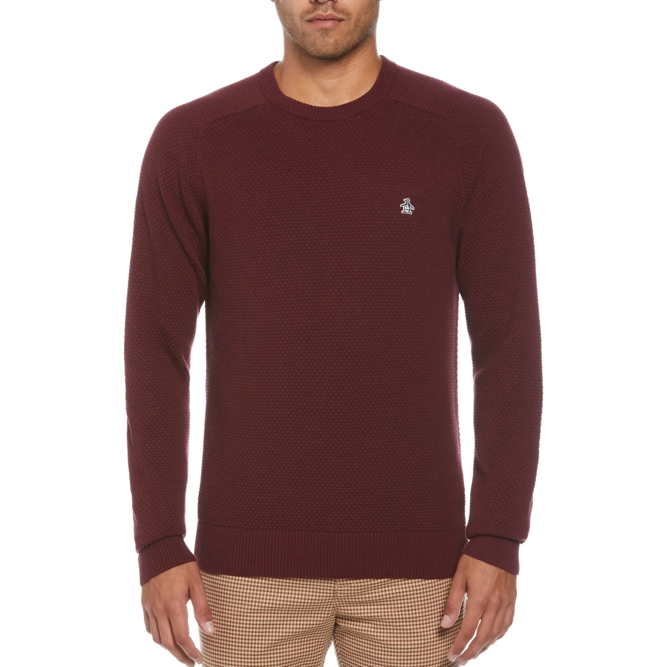 Featuring a classic crew neck design, this casual sweater from Original Penguin will be a versatile addition to your wardrobe. The sweater is crafted from soft, breathable 100% cotton fabric for impressive comfort. Bubble stitching gives the material an eye-catching texture that will look sharp paired with everything from smooth slacks to jeans. Ribbing along the neckline, cuffs and hem and a logo featuring our mascot Pete on the chest complete the sophisticated yet casual look.