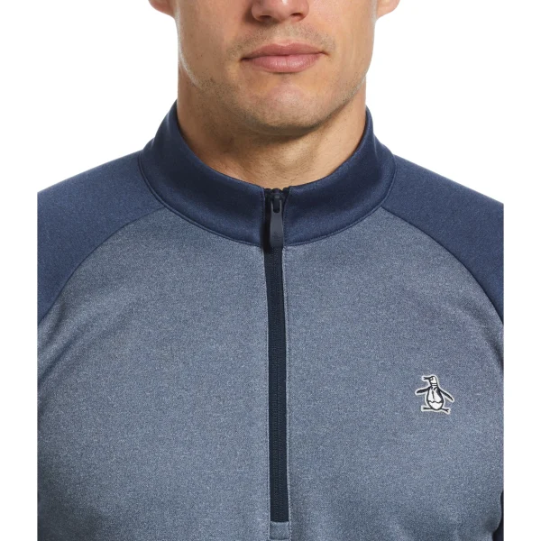 Tackle cool weather in sleek modern style with this color blocked pullover sweater from Original Penguin. The men’s long sleeve top is crafted from soft, warm fleece that’s been enhanced with stretch to help ensure a comfortable fit. Raglan sleeves add casual flair to the design, while a mock collar helps to shield your neck from the elements. A versatile sweater eco-conscious shoppers can wear with pride, it’s made from 45% recycled polyester.