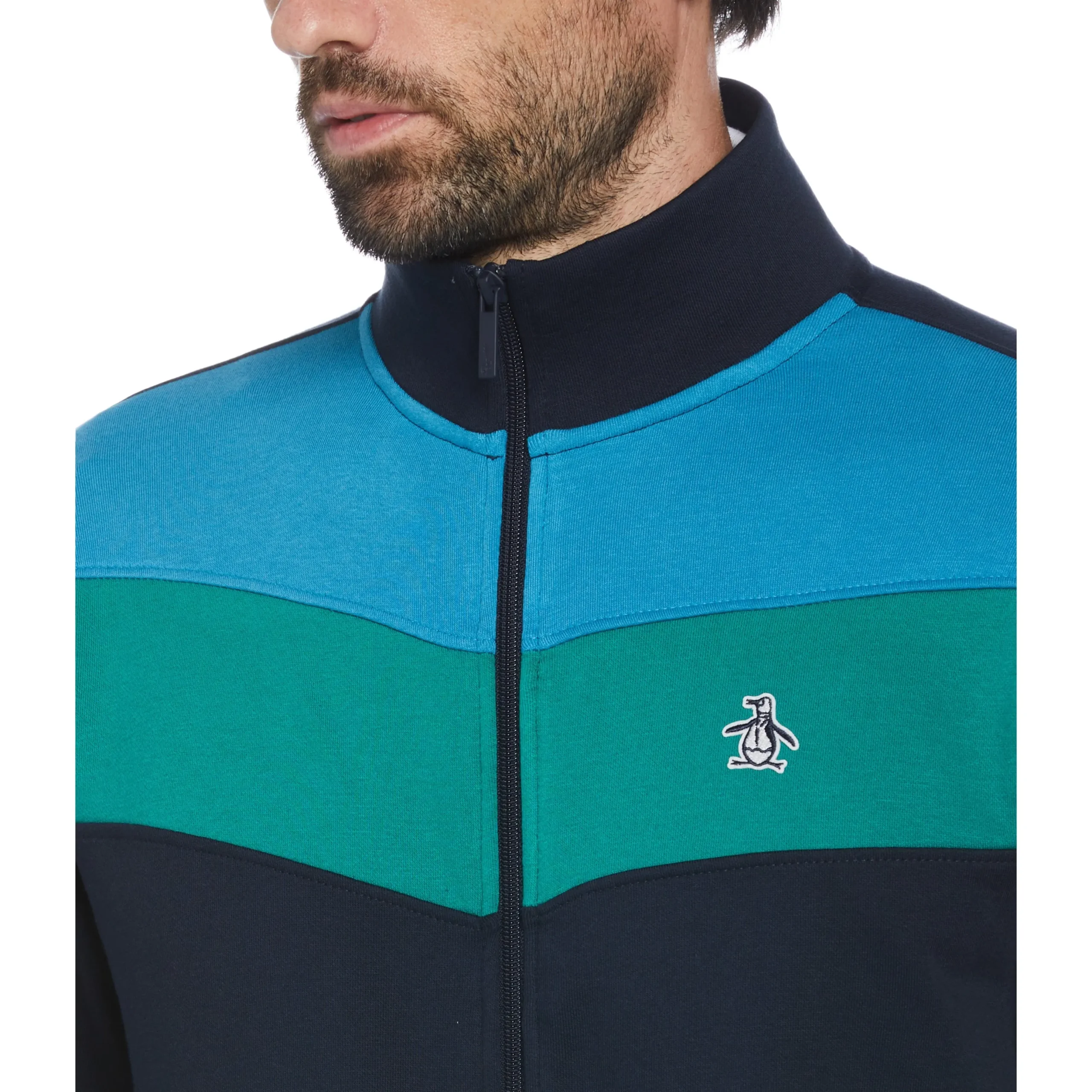 Add a retro-inspired outerwear piece to your cool-weather collection with this Original Penguin men’s track jacket. Featuring soft and warm fleece fabrication this jacket is designed to keep you cozy when the temperature dips. The full-zip closure allows for easy layering and the color block pattern adds a fresh, sporty style. Front pockets help keep hands warm and a sticker Pete logo adds a fashionable finishing touch.