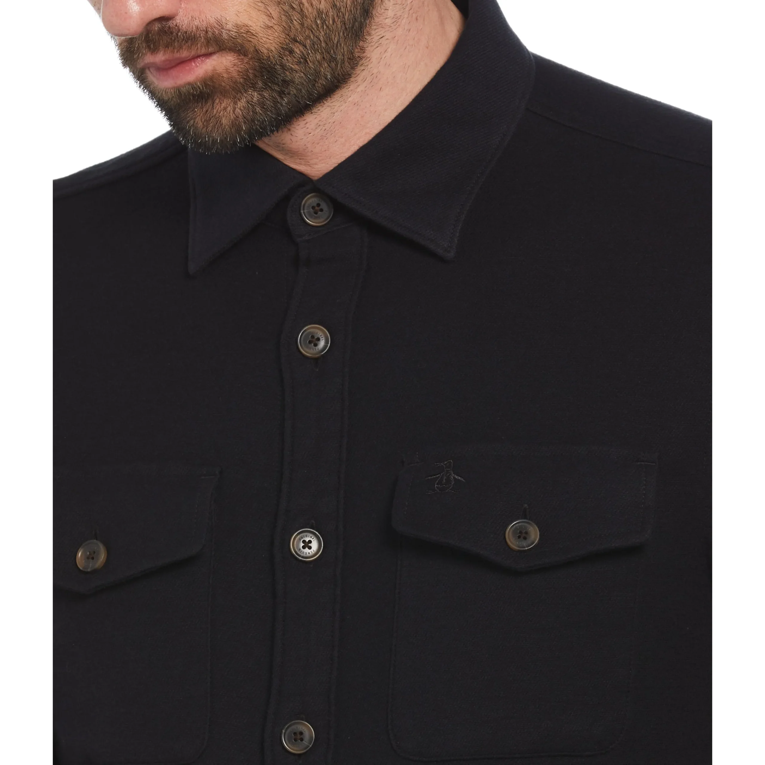 Layer up for cool weather with this sturdy overshirt from Original Penguin. The men’s button-up shirt is made with dur…