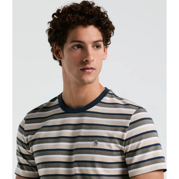 Level up your everyday outfits with this eye-catching jacquard stripe men’s t-shirt from Original Penguin. Great for both casual wear around town and lounging at home, the slim-fitting men’s shirt is crafted with a jersey knit for impressive softness. The back of the neck is taped to help minimize chafing, and our mascot Pete makes a cameo on the chest to add a boost of suave style to the design. Made with 45% recycled polyester, this crew neck shirt is a great option for eco-conscious shoppers.