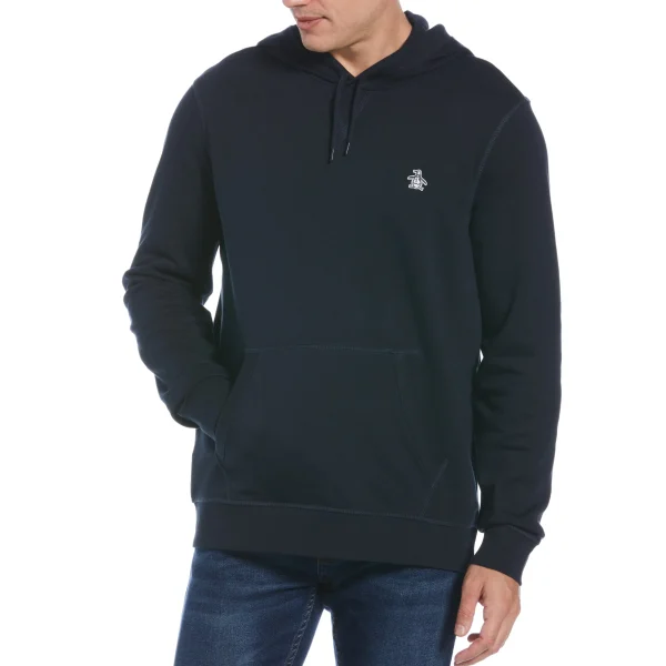Add both cool style and lightweight warmth to your wardrobe with this versatile solid-colored men’s hoodie from Original Penguin. The men’s hooded sweatshirt is made from soft fleece, with a large kangaroo pocket at the front to help protect your hands from the elements. The hood has a draw cord to help keep it in place on windy days, while the classic pullover design offers a relaxed casual look. A sticker-inspired version of our mascot Pete appears on the chest, giving the laidback design his stamp of approval.