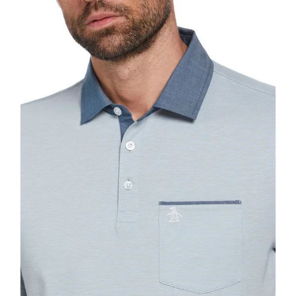 This Original Penguin polo top always has your back. Featuring a flattering slim fit, short sleeves and a ribbed chambray collar, it’s a comfortable and stylish addition to your casual wardrobe. This men’s polo is made from cotton jersey fabric that is breathable and feels soft against the skin. An all-over striped print, contrasting collar and cuffs, and a pocket with trim add stylish detail while still remaining versatile.