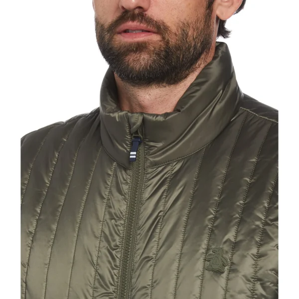 Upgrade your outerwear with this eco-friendly Original Penguin men’s vest designed for warmth and style. Crafted from 100% recycled polyester made from plastic bottles, this sleek slim fit vest merges sustainability with fashion. The plain weave fabrication delivers enhanced durability, while the full zipper allows for easy wear and layering. A sophisticated vertical channel design completes the look.