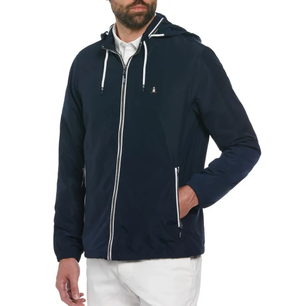This Original Penguin men’s jacket combines eco-friendly style with practicality. Made from recycled polyester for sustainability, this jacket is also water resistant and has a lining to help you feel warm and dry through unpredictable weather. Made for style as well, this jacket has a slim fit for a modern look. It’s finished with a durable plain weave fabric for resilience and a full zipper closure for convenience and easy wear.