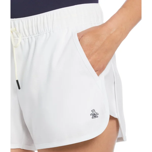Look and perform like a winner in this Original Penguin women’s tennis short. The plain weave fabrication creates a tightly woven pattern for a longer lasting garment. An adjustable drawstring waistband provides a custom fit that flexes when you do. The 4-way stretch fabric adds greater mobility so you can move freely on the court. Convenient back and side pockets let you hold tennis balls in these tennis shorts for ladies. Made with 40% Repreve™ recycled polyester from plastic bottles, you can feel good about adding these shorts to your athletic wardrobe. Penguin Pete gives his stamp of approval on the lower left hem.